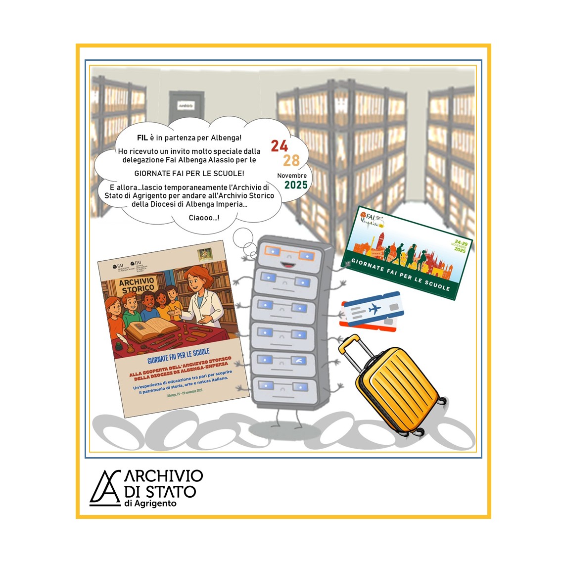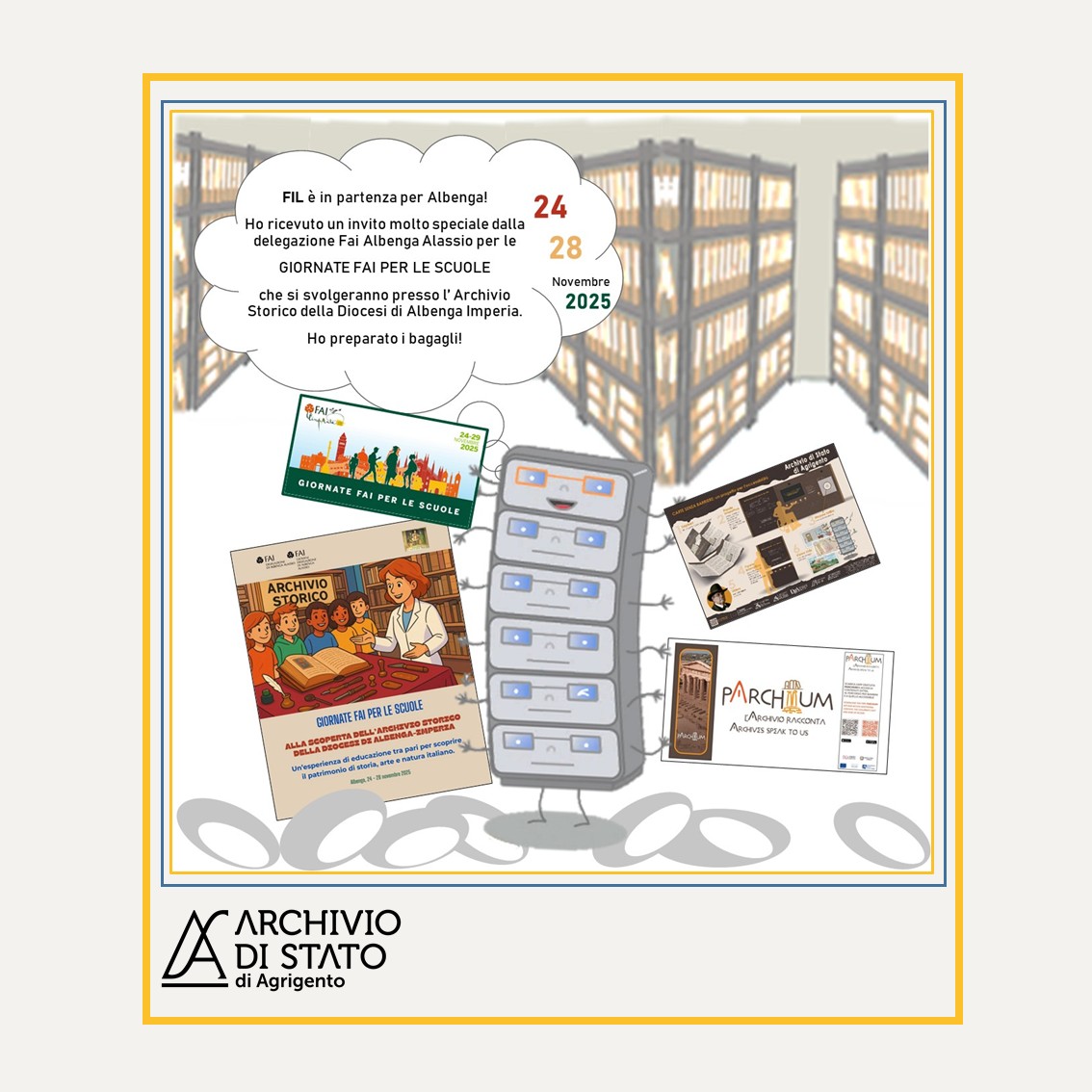 In occasione delle Giornate FAI per le scuole e delle attività didattiche programmate dal FAI Delegazione Albenga-Alassio, l'Archivio di Stato di Agrigento propone una selezione di contenuti digitali che possono illustrare le attività di settore, permettere una “visita virtuale” del nostro Istituto e, al contempo, in occasione di Agigento Capitale italiana della Cultura 2025, offrire uno sguardo sul territorio di Agrigento e sulle sue evidenze culturali, attraverso le fonti archivistiche.