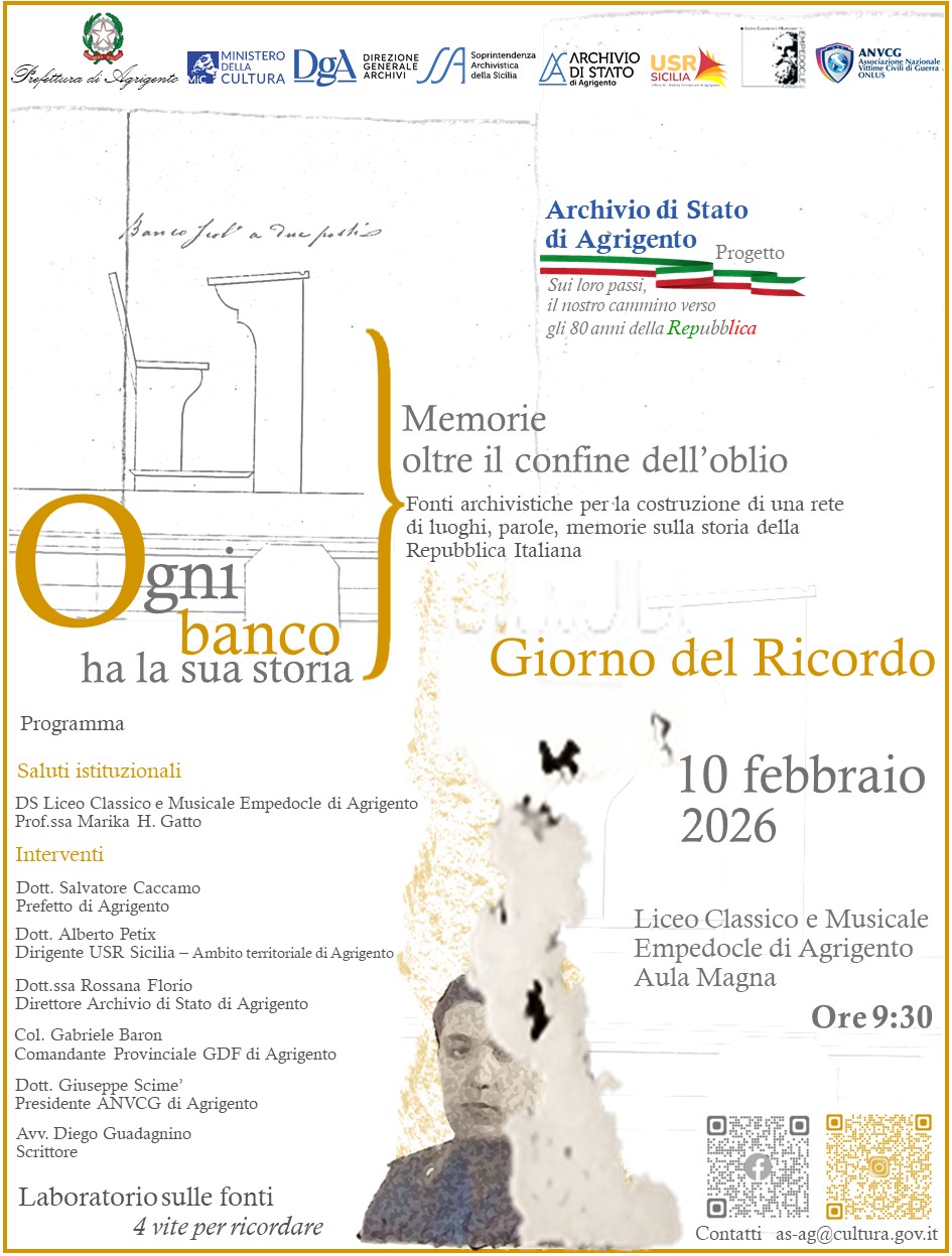 | L’Archivio di Stato di Agrigento, nell’ambito del progetto denominato "Sui loro passi, il nostro cammino verso gli 80 anni della Repubblica", che coniuga fonti archivistiche sulla storia della scuola e memorie storiche del territorio, ha individuato nel 3 dicembre 2025, Giornata internazionale delle persone con disabilità, la terza tappa di un percorso di riflessione rispetto a temi storici, sociali e culturali. In continuità con le azioni finalizzate all’accessibilità culturale del patrimonio archivistico e in linea con i progetti già avviati dall’Istituto, per la Giornata internazionale delle persone con disabilità, è stato organizzato l’ evento dal titolo Ogni banco ha la sua storia. Sui banchi di scuola con FIL, che si svolgerà in data 3 dicembre 2025, dalle ore 9:00 alle ore 18:00. In occasione della manifestazione, svolta in collaborazione con il Centro Polispecialistico Caleido di Agrigento, saranno fruibili attività di laboratorio ed esperienze tattili, multisensoriali e digitali legate alla sezione “Accessibilità culturale” dell’Archivio di Stato di Agrigento, con particolare attenzione ai contesti educativi e didattici, ai contesti di cura e benessere della persona e ai percorsi inclusivi. La manifestazione sarà, altresì, occasione di fruizione del percorso “Carte senza barriere: fruizione ampliata del patrimonio archivistico”, dedicato alla storia dell’ ex Carcere di San Vito e sviluppato nell’ambito del PNRR - Missione 1 – Digitalizzazione, Innovazione, Competitività e Cultura - Componente 3 – Cultura 4.0 (M1C3) – Misura 1 “Patrimonio Culturale per la Prossima Generazione” - Investimento 1.2 “Rimozione delle Barriere Fisiche e Cognitive in Musei, Biblioteche e Archivi per consentire un più ampio accesso e partecipazione alla cultura”. Nella giornata del 3 dicembre 2025 si svolgerà, inoltre, un laboratorio didattico multisensoriale legato all’avatar FIL del progetto Carte senza barriere e alla storia dei tessuti. La manifestazione si configura come un’occasione di incontro e di sensibilizzazione rispetto al tema della disabilità, dell’accesso al patrimonio culturale, della fruizione ampliata del patrimonio culturale e della partecipazione attiva.