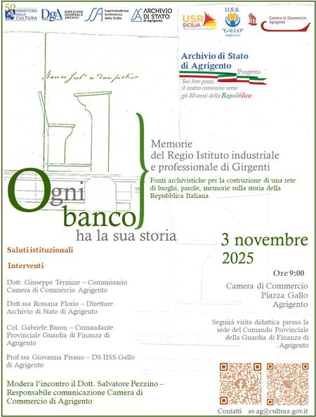 ![]() | E' ufficialmente iniziato il 3 novembre il progetto "Sui loro passi, il nostro cammino verso gli 80 anni della Repubblica", sul tema OGNI BANCO HA LA SUA STORIA. MEMORIE DEL REGIO ISTITUTO INDUSTRIALE E PROFESSIONALE DI GIRGENTI. Non poteva esserci un inizio migliore! Una partecipata manifestazione rivolta agli studenti dell' Istituto Istruzione Secondaria Superiore Gallo e ITET Sciascia di Agrigento, ospitata nella bellissima cornice della Camera di Commercio di Agrigento e poi presso la Caserma della Guardia di Finanza di Agrigento. Tutti uniti nelle riflessioni sulla storia del Regio Istituto industriale e professionale di Girgenti. Una storia che intreccia altre storie e che prepara alla celebrazione del 4 novembre 2025, Giornata dell'Unità Nazionale e delle Forze Armate, nel ricordo dei "ragazzi del '99", studenti di quella scuola. Un sentito e doveroso ringraziamento è rivolto alla Camera di Commercio di Agrigento, alla Guardia di Finanza di Agrigento, al DS, ai docenti e agli alunni dell'IISS Gallo-ITET Sciascia, all'USR Sicilia Ufficio IV Ambito territoriale di Agrigento, alle autorità presenti. Torneremo, ancora, insieme...a ripercorrere i passi degli studenti del passato...per affrontare nuovi temi e nuovi percorsi nella storia. |