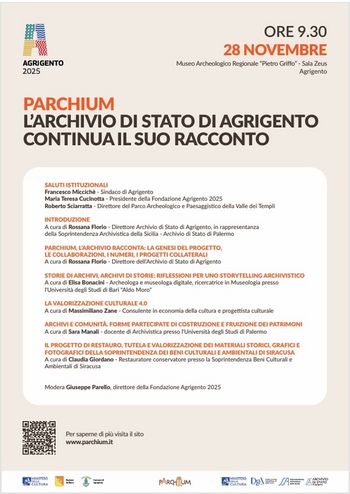 L’Archivio di Stato di Agrigento, nell’ambito del programma di Agrigento Capitale Italiana della Cultura 2025 dedicato alla sezione “digitalizzazione degli archivi”, su invito della Fondazione Agrigento Capitale Italiana della Cultura 2025, in data 28 novembre 2025, presso la Sala Zeus del Museo Archeologico Regionale “Pietro Griffo” di Agrigento, parteciperà al convegno dal titolo “Parchium. L’Archivio di Stato di Agrigento continua il suo racconto”, per approfondire gli aspetti delle soluzioni digitali del progetto Parchium – L’archivio racconta. La manifestazione rappresenta, altresì, un’ulteriore occasione di promozione e divulgazione del progetto “Parchium – L’Archivio racconta” e delle attività legate alla digitalizzazione del patrimonio archivistico. Il progetto, sviluppato grazie al “Programma Operativo Nazionale “Cultura e Sviluppo” FESR 2014-2020”, volto a implementare le “Attività conoscitive nel Parco della Valle dei Templi attraverso le fonti archivistiche”, propone diversi nuclei tematici e percorsi targettizzati per una dimensione narrativa innovativa, enfatizzata da un rimando continuo tra on-line e on-site, grazie alla tecnologia di geolocalizzazione presente nella APP. Composto da una piattaforma web, una applicazione digitale geolocalizzata (APP) e da un pratico supporto fisico (itinerario e mappa), per accompagnare i visitatori della città di Agrigento in un percorso interattivo ed integrato, attraverso una inedita formula di accessibilità, composta da molteplici dispositivi di lettura digitale e cross-mediale, multilingua e multilivello, con contenuti accessibili da chiunque, con particolare attenzione ai giovani visitatori e alle persone non vedenti, ipovedenti e non udenti, il progetto si fa promotore di un modo nuovo di raccontarsi e di raccontare lo straordinario intreccio di storie che traspare dai documenti dell’Archivio di Stato di Agrigento, dove il presente e il passato si alternano, offrendo la possibilità di entrare in contatto diretto con le voci nascoste, tra le pieghe del tempo, dei protagonisti della storia della Valle dei Templi di Agrigento: dall’archeologia di scavo, con le sue straordinarie scoperte, fino agli impegnativi restauri, al recupero e alla valorizzazione del patrimonio dell’odierno Parco, in stretto legame con l’intero territorio e la collettività. Itinerari, storie e documenti sono accessibili attraverso strumenti dedicati anche ai bambini, nella sezione “Archi”, e agli utenti con disabilità uditive e visive. Il progetto è, inoltre, collegato alla Digital Library presente sul Portale Archivio Digitale (ICAR), pubblicata nel mese di gennaio 2024, e al progetto Fumetti nei musei. Il programma dell’ incontro prevede un intervento introduttivo, a cura del Direttore dell’Archivio di Stato di Agrigento, Dott.ssa Rossana Florio, in rappresentanza della Soprintendenza Archivistica – Archivio di Stato di Palermo, un intervento specifico sul progetto Parchium, l’Archivio racconta, per illustrare la genesi del progetto e la sua disseminazione, una serie di interventi sul tema della digitalizzazione, comunicazione, buone prassi a cura dei relatori individuati (Dott. Massimiliano Zane, Dott.ssa Elisa Bonacini, Dott.ssa Sara Manali, Dott.ssa Claudia Giordano). L’incontro sarà moderato dal Direttore della Fondazione Agrigento Capitale Italiana della Cultura, Arch. Giuseppe Parello. Link al progetto PArchium. L’Archivio racconta