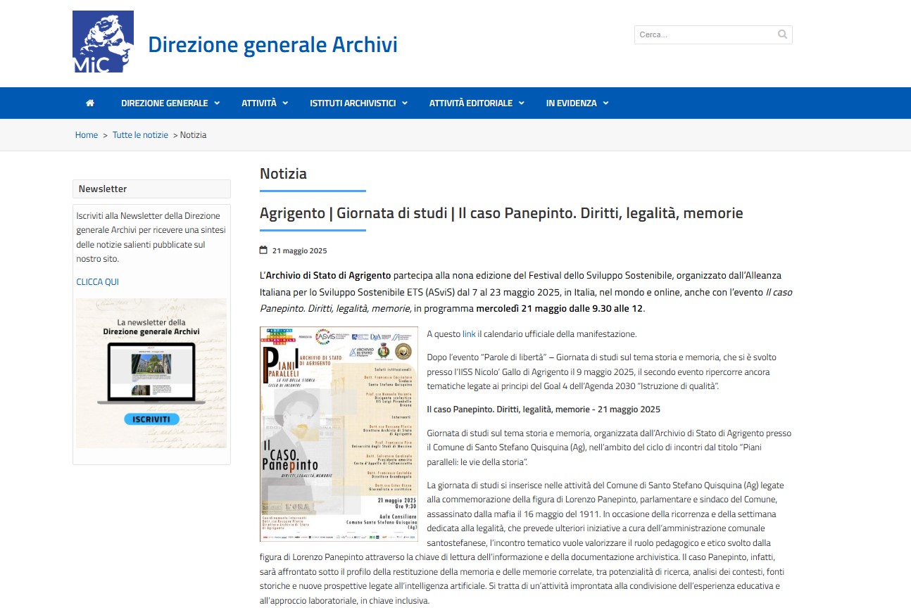 21 Maggio 2025 siamo nelle Notizie della Direzione Generale Archivi con - "Agrigento | Giornata di studi | Il caso Panepinto. Diritti, legalità, memorie"