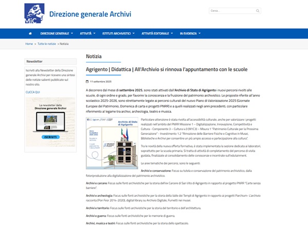 11 settembre 2025 siamo nelle Notizie della Direzione Generale Archivi con Agrigento | Didattica | All'Archivio si rinnova l'appuntamento con le scuole
