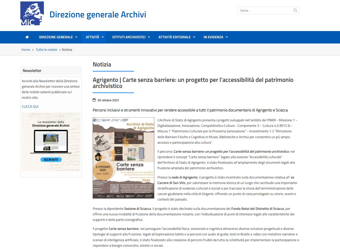 5 Ottobre 2025 siamo nelle Notizie della Direzione Generale Archivi con - Agrigento | Carte senza barriere: un progetto per l'accessibilità del patrimonio archivistico