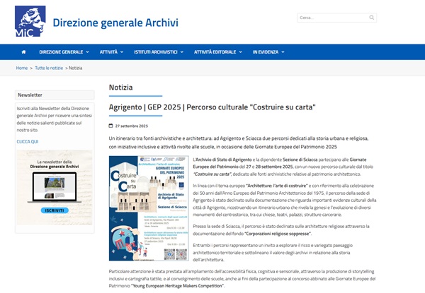27-28 settembre 2025 siamo nelle Notizie della Direzione Generale Archivi con - Agrigento | GEP 2025 | Percorso culturale "Costruire su carta"